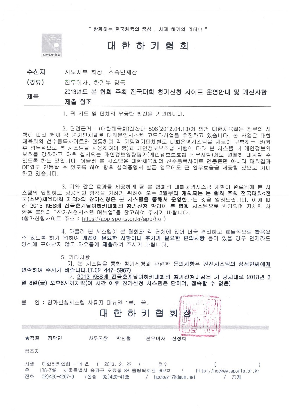2013년도 본 협회 주최 전국대회 참가신청 사이트 운영안내 및 개선사항 페이지 정보 작성자 하키협회 댓글 0건 조회 14,877회 작성일 13-02-22 본문 첨부파일 하키_인터넷참가신청.pdf (652.4K) 목록 이전글 2013년도 1급 경기지도자 자격취득 지원자 모집 안내 다음글 2013 KBS배 전국춘계 남.여 하키대회 개최 안내 이전글2013년도 1급 경기지도자 자격취득 지원자 모집 안내 13.03.07 다음글2013 KBS배 전국춘계 남.여 하키대회 개최 안내 13.02.22