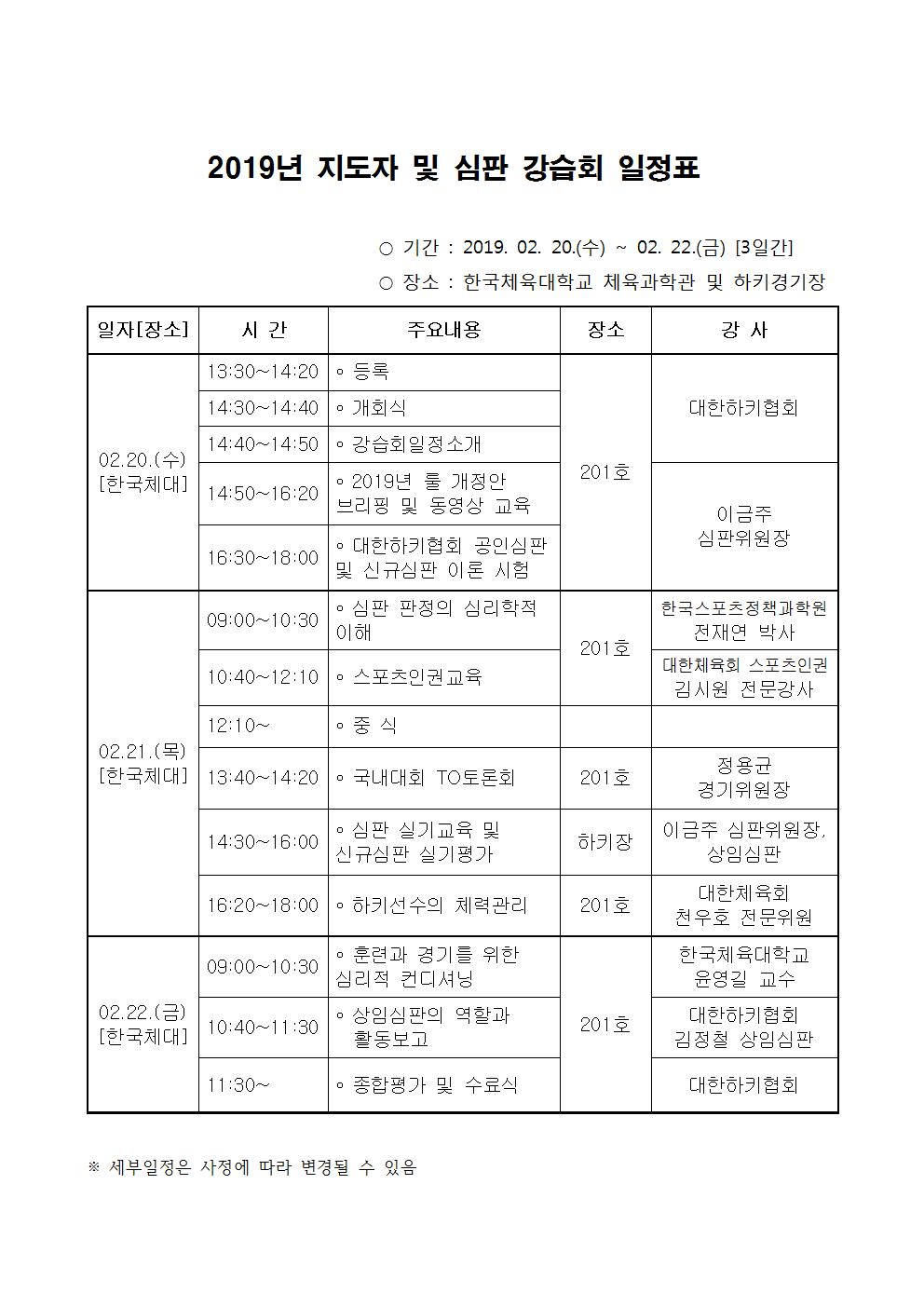 2019년 지도자 및 심판 강습회 일정표 입니다.(수정) 페이지 정보 작성자 하키협회 댓글 0건 조회 15,960회 작성일 19-02-13 본문 . 목록 이전글 국제하키연맹 아카데미 Level 2, 3 코칭 강습회 및 Level 3 기술임원 강습회 다음글 엘리트 선수 야외훈련에 따른 건강보호 가이드 배포 이전글국제하키연맹 아카데미 Level 2, 3 코칭 강습회 및 Level 3 기술임원 강습회 19.02.13 다음글엘리트 선수 야외훈련에 따른 건강보호 가이드 배포 19.02.01