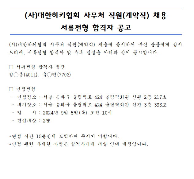 (사)대한하키협회 사무처 직원(계약직) 채용 서류전형 합격자 공고 페이지 정보 작성자 하키협회 댓글 0건 조회 1,371회 작성일 24-09-03 본문 - 목록 이전글 2024년 대한하키협회 계약직채용 최종합격자 공고 이전글2024년 대한하키협회 계약직채용 최종합격자 공고 24.09.05