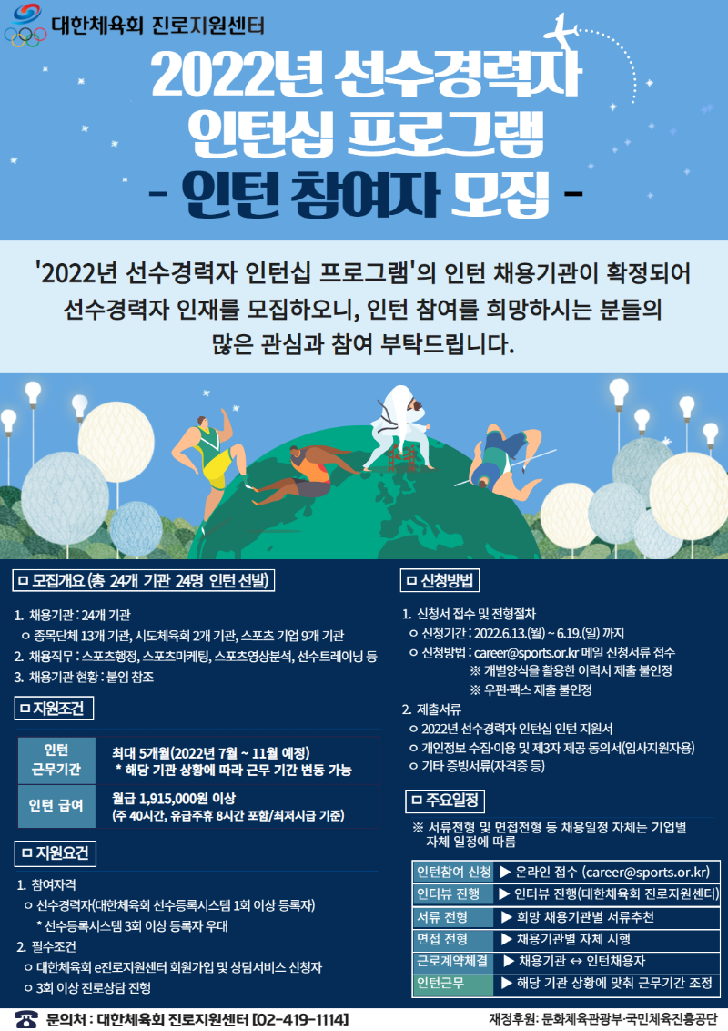 2022년 선수경력자 인턴십 프로그램 -인턴 참여자 모집- 페이지 정보 작성자 하키협회 댓글 0건 조회 6,521회 작성일 22-06-14 본문 첨부파일 인턴참여자모집공고문0613.hwp (136.0K) 인턴지원서및개인정보동의서.hwp (133.5K) 목록 이전글 2022 대한하키협회 계약직(대체근무자) 채용 재공고 다음글 2022 대한하키협회 대체근무자 채용 공고 (재공고) 이전글2022 대한하키협회 계약직(대체근무자) 채용 재공고 22.06.20 다음글2022 대한하키협회 대체근무자 채용 공고 (재공고) 22.06.09