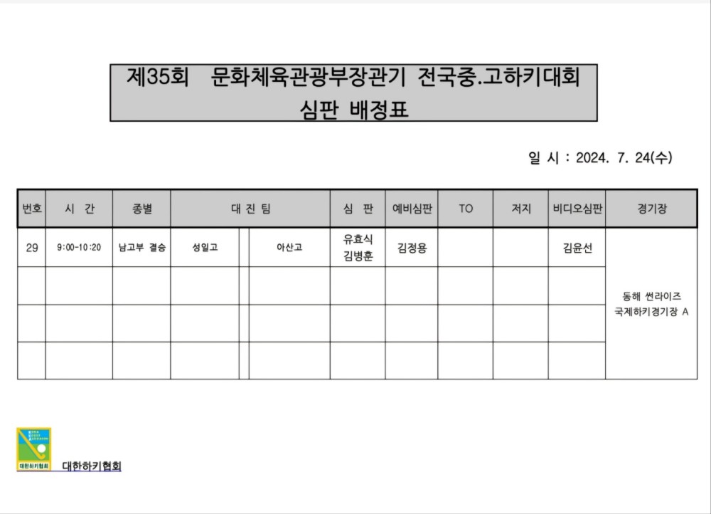 제35회 문화체육관광부장관기 전국중고하키대회 심판배정표(7.24.) 페이지 정보 작성자 하키협회 댓글 0건 조회 3,485회 작성일 24-07-18 본문 제35회 문화체육관광부장관기 전국중고하키대회 심판배정표(7.24.) 목록 이전글 제35회 문화체육관광부장관기 전국중고하키대회 경기결과표 다음글 2024 한국대학실업연맹 회장배 남여하키대회 대회결과표 이전글제35회 문화체육관광부장관기 전국중고하키대회 경기결과표 24.07.19 다음글2024 한국대학실업연맹 회장배 남여하키대회 대회결과표 24.07.16