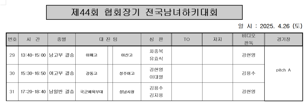 제44회 협회장기 전국남녀하키대회 심판배정표(4.26.) > 국내대회