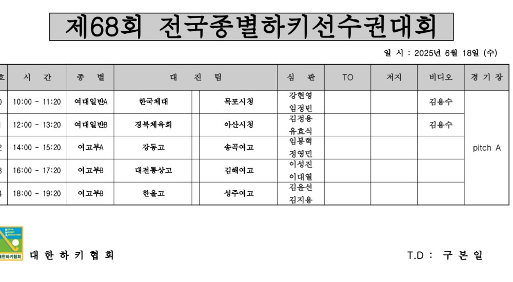 제68회 전국종별하키선수권대회 심판배정표(6.18.) 페이지 정보 작성자 하키협회 댓글 0건 조회 1,150회 작성일 25-06-17 본문 제68회 전국종별하키선수권대회 심판배정표(6.18.) 목록 이전글 제68회 전국종별하키선수권대회 심판배정표(6.19.) 다음글 제68회 전국종별하키선수권대회 심판배정표(6.17.) 수정사항 반영 이전글제68회 전국종별하키선수권대회 심판배정표(6.19.) 25.06.18 다음글제68회 전국종별하키선수권대회 심판배정표(6.17.) 수정사항 반영 25.06.16