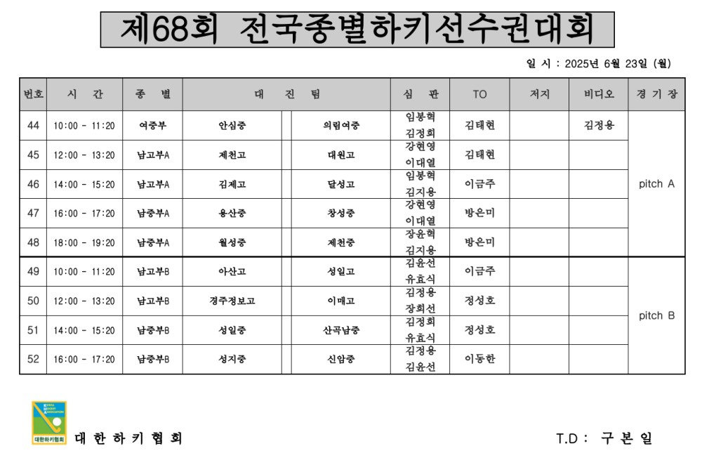 제68회 전국종별하키선수권대회 심판배정표(6.23.) 페이지 정보 작성자 하키협회 댓글 0건 조회 1,138회 작성일 25-06-22 본문 제68회 전국종별하키선수권대회 심판배정표(6.23.) 목록 이전글 제68회 전국종별하키선수권대회 심판배정표(6.24.) 다음글 제68회 전국종별하키선수권대회 심판배정표(6.22.) 이전글제68회 전국종별하키선수권대회 심판배정표(6.24.) 25.06.23 다음글제68회 전국종별하키선수권대회 심판배정표(6.22.) 25.06.21