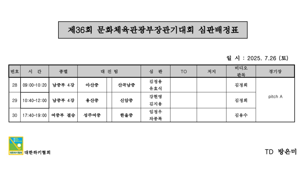 제36회 문화체육관광부장관기 전국중고하키대회 심판배정표(7.26.) 페이지 정보 작성자 하키협회 댓글 0건 조회 915회 작성일 25-07-25 본문 제36회 문화체육관광부장관기 전국중고하키대회 심판배정표(7.26.) 목록 이전글 제39회 대통령기 전국하키대회 경기일정표(추첨결과반영) 다음글 제39회 대통령기 전국하키대회 및 제25회 대한체육회장배 전국생활체육하키대회 참가팀 현황 이전글제39회 대통령기 전국하키대회 경기일정표(추첨결과반영) 25.07.26 다음글제39회 대통령기 전국하키대회 및 제25회 대한체육회장배 전국생활체육하키대회 참가팀 현황 25.07.25