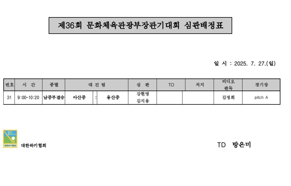 제36회 문화체육관광부장관기 전국중고하키대회 심판배정표(7.27.) 페이지 정보 작성자 하키협회 댓글 0건 조회 902회 작성일 25-07-26 본문 제36회 문화체육관광부장관기 전국중고하키대회 심판배정표(7.27.) 목록 이전글 제36회 문화체육관광부장관기 전국중고하키대회 대회결과 다음글 제39회 대통령기 전국하키대회 경기일정표(추첨결과반영) 이전글제36회 문화체육관광부장관기 전국중고하키대회 대회결과 25.07.27 다음글제39회 대통령기 전국하키대회 경기일정표(추첨결과반영) 25.07.26