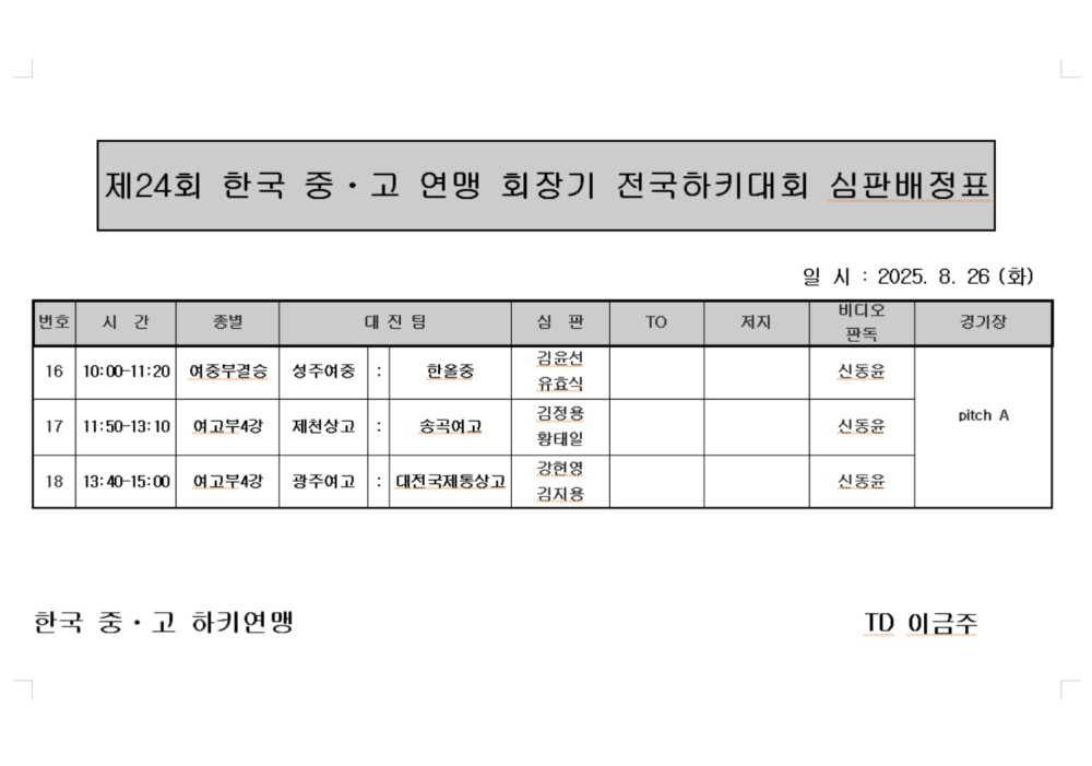 제24회 한국중∙고하키연맹 회장기 전국하키대회 심판배정표(8.26.) 페이지 정보 작성자 하키협회 댓글 0건 조회 1,095회 작성일 25-08-23 본문 제24회 한국중∙고하키연맹 회장기 전국하키대회 심판배정표(8.26.) 목록 이전글 제24회 한국중∙고하키연맹 회장기 전국하키대회 심판배정표(8.27.) 다음글 2025 하키 U15 H1 디비전 리그 참가팀 현황 이전글제24회 한국중∙고하키연맹 회장기 전국하키대회 심판배정표(8.27.) 25.08.26 다음글2025 하키 U15 H1 디비전 리그 참가팀 현황 25.08.22