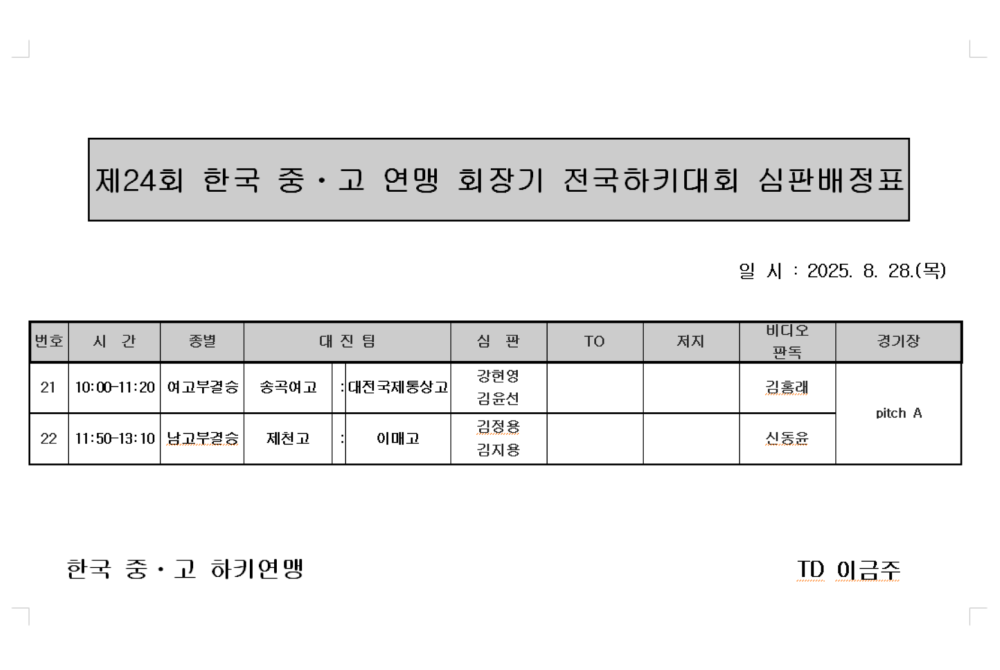 제24회 한국중∙고하키연맹 회장기 전국하키대회 심판배정표(8.28.) 페이지 정보 작성자 하키협회 댓글 0건 조회 735회 작성일 25-08-27 본문 제24회 한국중∙고하키연맹 회장기 전국하키대회 심판배정표(8.28.) 목록 이전글 제24회 한국중∙고하키연맹 회장기 전국하키대회 대회결과 다음글 2025 KHA 실내하키 U15 H1 디비전 리그 경기 일정표(추첨결과반영) 이전글제24회 한국중∙고하키연맹 회장기 전국하키대회 대회결과 25.08.28 다음글2025 KHA 실내하키 U15 H1 디비전 리그 경기 일정표(추첨결과반영) 25.08.27