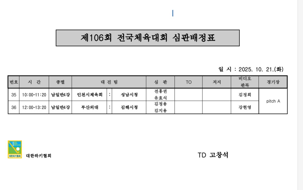 제106회 전국체육대회 심판배정표(10.21.) 페이지 정보 작성자 하키협회 댓글 0건 조회 683회 작성일 25-10-20 본문 제106회 전국체육대회 심판배정표(10.21.) 목록 이전글 제106회 전국체육대회 심판배정표(10.22.) 다음글 제106회 전국체육대회 심판배정표(10.20.) 이전글제106회 전국체육대회 심판배정표(10.22.) 25.10.21 다음글제106회 전국체육대회 심판배정표(10.20.) 25.10.19
