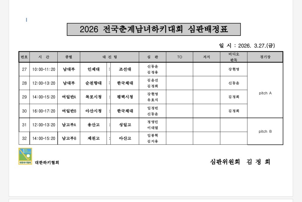 2026 전국춘계남녀하키대회 심판배정표 (03.27.) 페이지 정보 작성자 하키협회 댓글 0건 조회 187회 작성일 26-03-26 본문 2026 전국춘계남녀하키대회 심판배정표 (03.27.) 목록 이전글 2026 전국춘계남녀하키대회 심판배정표 (03.28.) 다음글 2026 전국춘계남녀하키대회 심판배정표 (03.26.) 이전글2026 전국춘계남녀하키대회 심판배정표 (03.28.) 26.03.27 다음글2026 전국춘계남녀하키대회 심판배정표 (03.26.) 26.03.25