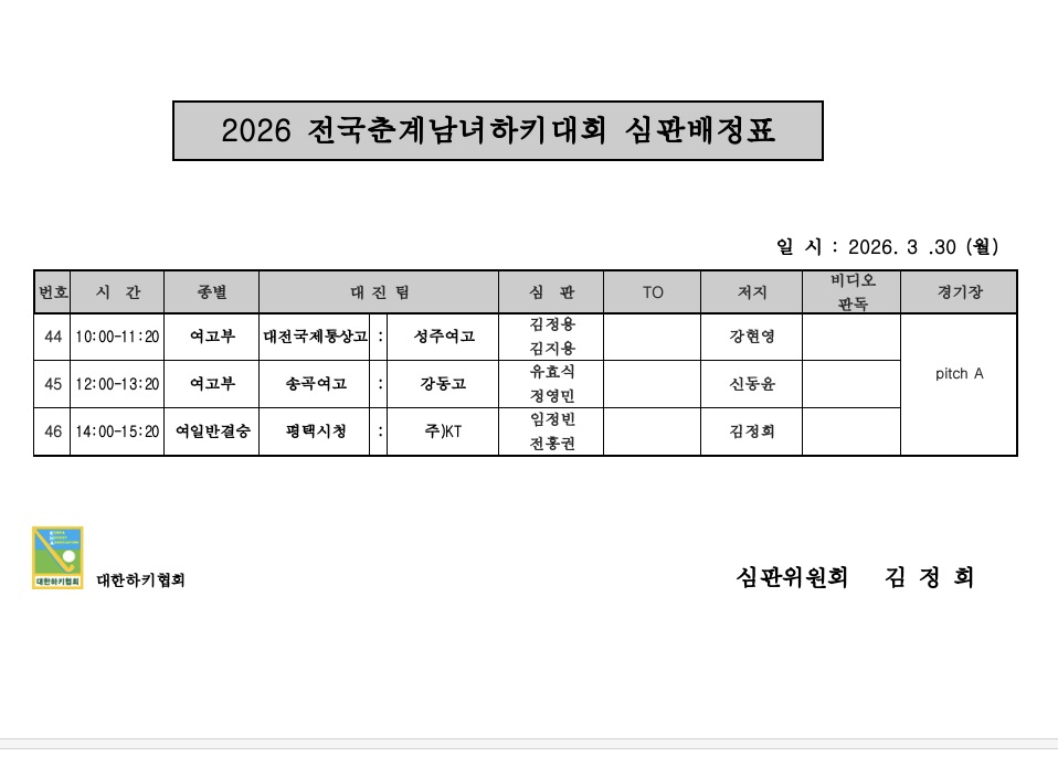 2026 전국춘계남녀하키대회 후 심판배정표 (03.30.) 페이지 정보 작성자 하키협회 댓글 0건 조회 175회 작성일 26-03-29 본문 2026 전국춘계남녀하키대회 심판배정표 (03.30.) 목록 이전글 대한하키협회 국내대회 라이브 영상 다시보기 안내 다음글 2026 전국춘계남녀하키대회 심판배정표 (03.29.) 이전글대한하키협회 국내대회 라이브 영상 다시보기 안내 26.03.30 다음글2026 전국춘계남녀하키대회 심판배정표 (03.29.) 26.03.28