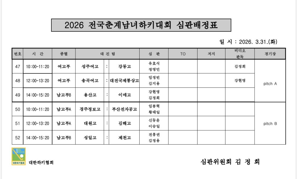 2026 전국춘계남녀하키대회 심판배정표 (03.31.) 페이지 정보 작성자 하키협회 댓글 0건 조회 216회 작성일 26-03-30 본문 2026 전국춘계남녀하키대회 심판배정표 (03.31.) 목록 이전글 2026 전국춘계남녀하키대회 심판배정표 (04.01.) 다음글 대한하키협회 국내대회 라이브 영상 다시보기 안내 이전글2026 전국춘계남녀하키대회 심판배정표 (04.01.) 26.03.31 다음글대한하키협회 국내대회 라이브 영상 다시보기 안내 26.03.30