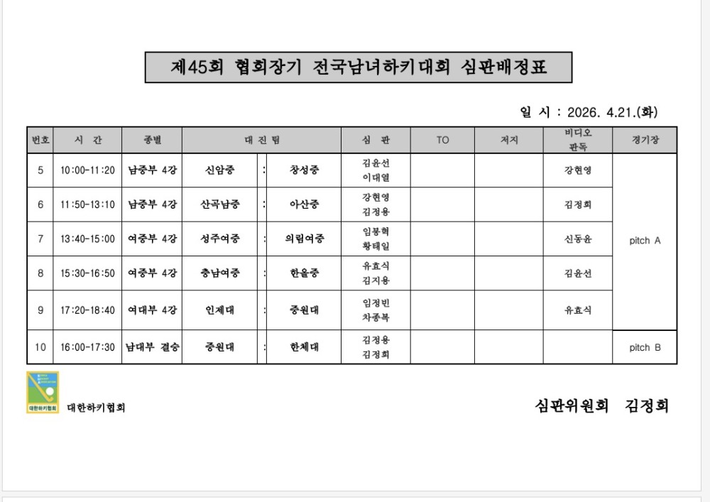 제45회 협회장기 전국남녀하키대회 심판배정표 (04.21.) 페이지 정보 작성자 하키협회 댓글 0건 조회 181회 작성일 26-04-20 본문 제45회 협회장기 전국남녀하키대회 심판배정표 (04.21.) 목록 이전글 제45회 협회장기 전국남녀하키대회 심판배정표 (04.22.) 다음글 제45회 협회장기 전국남녀하키대회 경기결과표 이전글제45회 협회장기 전국남녀하키대회 심판배정표 (04.22.) 26.04.21 다음글제45회 협회장기 전국남녀하키대회 경기결과표 26.04.20