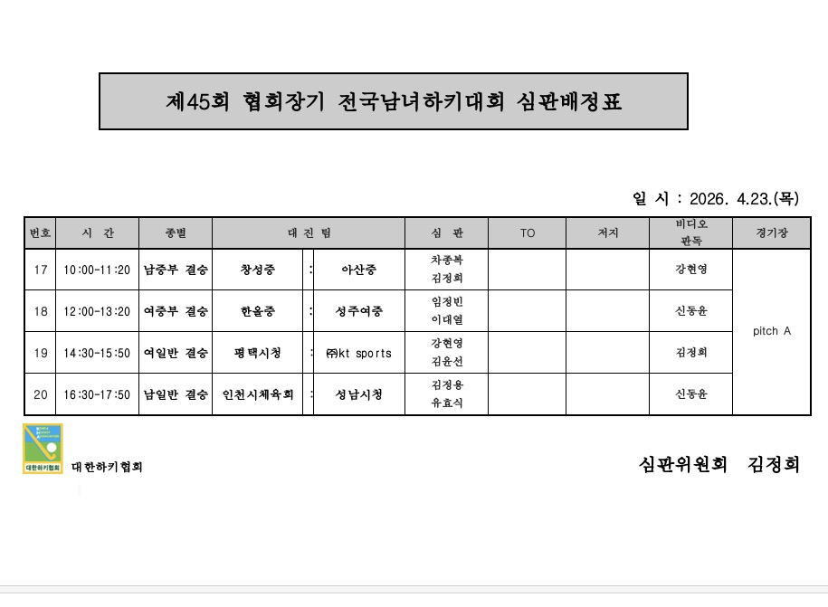 제45회 협회장기 전국남녀하키대회 심판배정표 (04.23.) 페이지 정보 작성자 하키협회 댓글 0건 조회 152회 작성일 26-04-22 본문 제45회 협회장기 전국남녀하키대회 심판배정표 (04.23.) 목록 다음글 대한하키협회 경기데이터 통합 분석 플랫폼 구축·운영 안내 다음글대한하키협회 경기데이터 통합 분석 플랫폼 구축·운영 안내 26.04.22