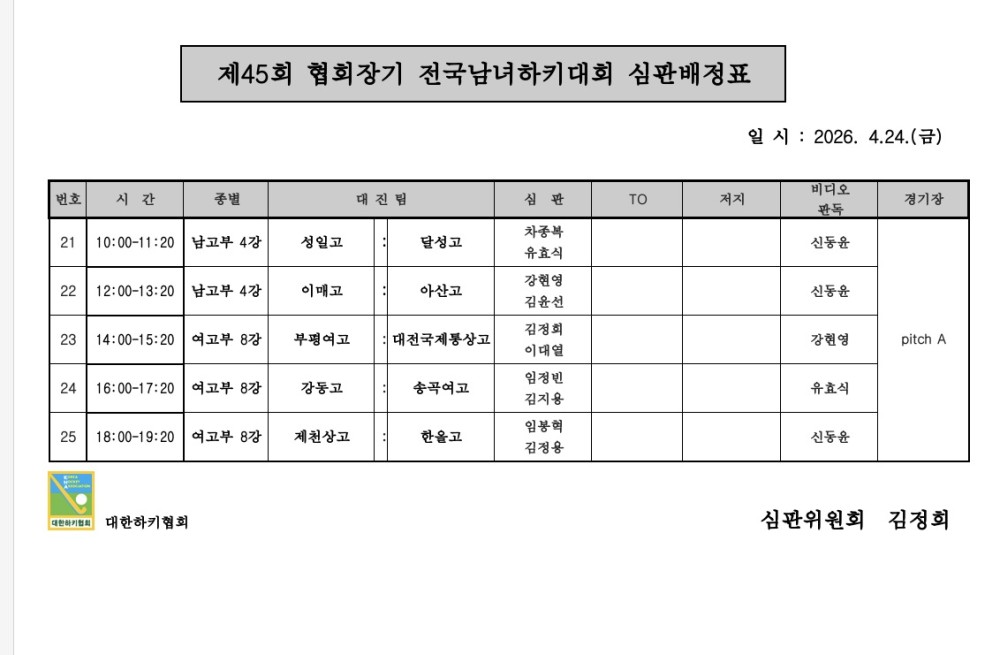 제45회 협회장기 전국남녀하키대회 심판배정표 (04.24.) 페이지 정보 작성자 하키협회 댓글 0건 조회 125회 작성일 26-04-23 본문 제45회 협회장기 전국남녀하키대회 심판배정표 (04.24.) 목록 다음글 제45회 협회장기 전국남녀하키대회 심판배정표 (04.23.) 다음글제45회 협회장기 전국남녀하키대회 심판배정표 (04.23.) 26.04.22
