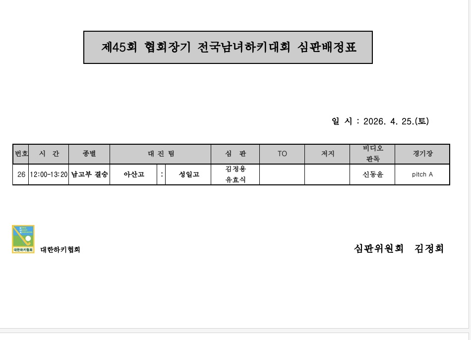 제45회 협회장기 전국남녀하키대회 심판배정표 (04.25.) 페이지 정보 작성자 하키협회 댓글 0건 조회 119회 작성일 26-04-24 본문 제45회 협회장기 전국남녀하키대회 심판배정표 (04.25.) 목록 이전글 제45회 협회장기 전국남녀하키대회 심판배정표 (04.26.) 다음글 제45회 협회장기 전국남녀하키대회 심판배정표 (04.24.) 이전글제45회 협회장기 전국남녀하키대회 심판배정표 (04.26.) 26.04.25 다음글제45회 협회장기 전국남녀하키대회 심판배정표 (04.24.) 26.04.23