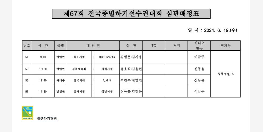 제67회 전국종별하키선수권대회 참가팀 현황 페이지 정보 작성자 하키협회 댓글 0건 조회 4,137회 작성일 24-05-24 본문 제67회 전국종별하키선수권대회 참가팀 현황을 붙임과 같이 알려드립니다. 붙임: 참가팀 현황 1부. 끝. 목록 이전글 제67회 전국종별하키선수권대회 경기결과표 다음글 제53회 전국소년체육대회 경기결과 이전글제67회 전국종별하키선수권대회 경기결과표 24.05.27 다음글제53회 전국소년체육대회 경기결과 24.05.23