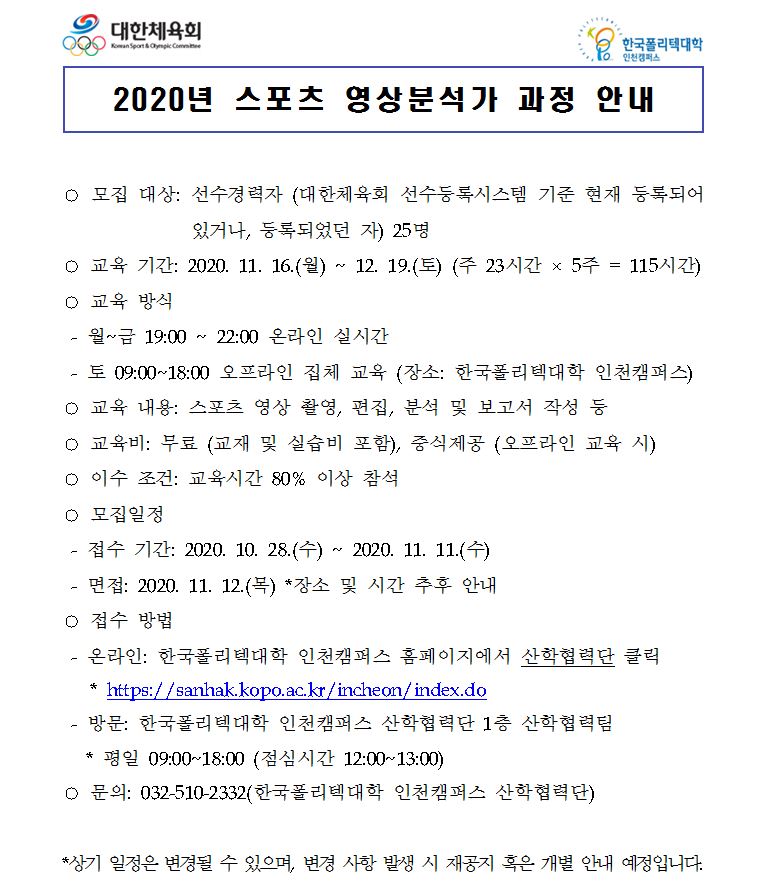 스포츠 영상분석가 과정 안내 페이지 정보 작성자 하키협회 댓글 0건 조회 10,945회 작성일 20-10-29 본문 대한체육회와 한국폴리텍대학이 스포츠 영상분석가 과정을 운영하오니 많은 참가 바랍니다 목록 이전글 대한체육회장 및 대한하키협회 회장선거 선거인 등록관련 알림. 다음글 2020 AHF Online Education Workshop (11월) 안내 이전글대한체육회장 및 대한하키협회 회장선거 선거인 등록관련 알림. 20.10.30 다음글2020 AHF Online Education Workshop (11월) 안내 20.10.27