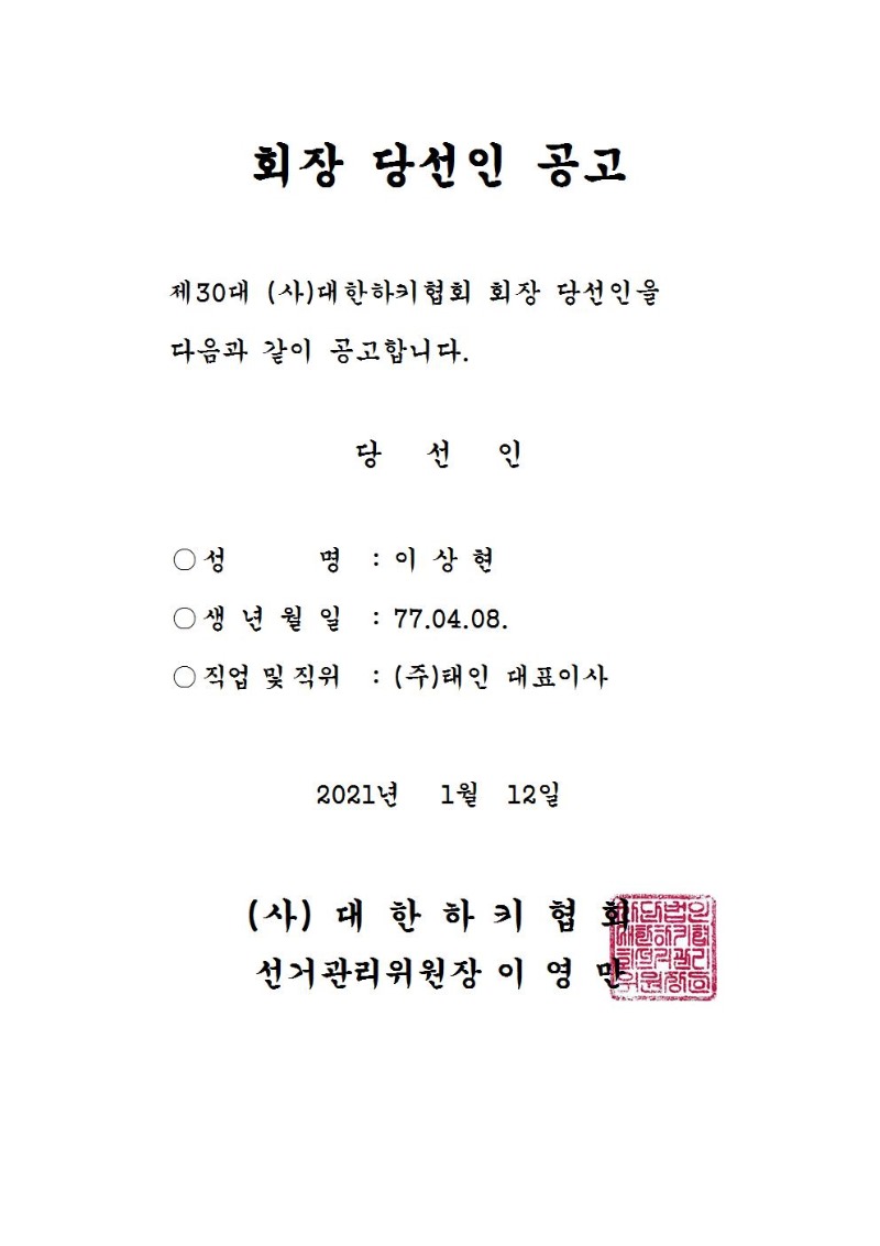제30대 (사)대한하키협회 회장 당선인 공고 페이지 정보 작성자 하키협회 댓글 0건 조회 12,606회 작성일 21-01-12 본문 목록 이전글 2021 AHF Online Education Workshop (2월) 안내 다음글 제30대 (사)대한하키협회 회장 선거일정 공고 이전글2021 AHF Online Education Workshop (2월) 안내 21.01.29 다음글제30대 (사)대한하키협회 회장 선거일정 공고 20.12.29