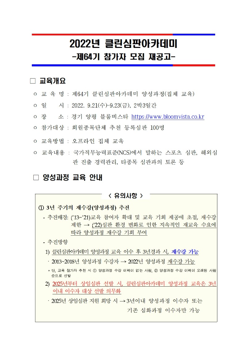 2022년 클린심판아카데미 제64기 참가자 모집 재공고 페이지 정보 작성자 하키협회 댓글 0건 조회 6,912회 작성일 22-09-06 본문 목록 이전글 23년 1차 국군대표(상무)선수 모집 계획 알림 다음글 2022년 청소년스포츠한마당 5인제 하키 개최 알림 이전글23년 1차 국군대표(상무)선수 모집 계획 알림 22.09.13 다음글2022년 청소년스포츠한마당 5인제 하키 개최 알림 22.08.29