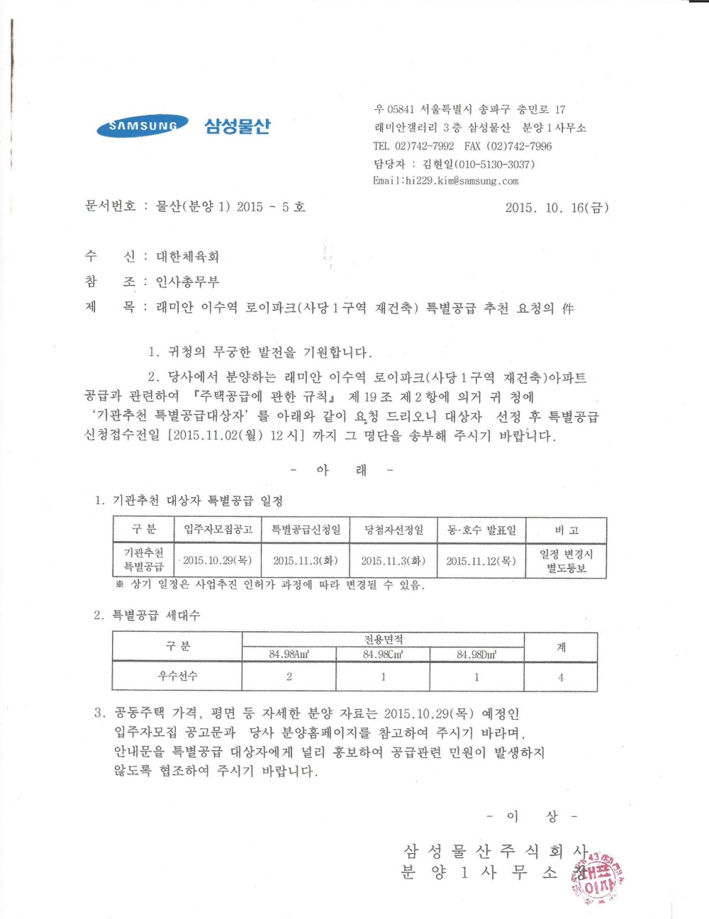 2. 위 호와 관련하여 래미안 이수역 로이파크(사당1구역 재건축)아파트 신규분양 내용을 알려온바주택공급에 관한규칙19조에 의거 자격요건을 갖춘 대상자 중 희망하는 대상자는 붙임자료를 참조하여 2015.11.05()까지 대한체육회 인사총무부로 제출하여 주시기 바랍니다.