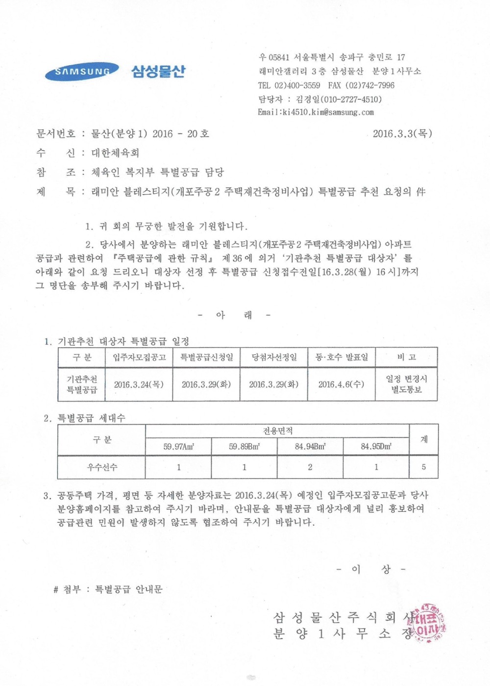 2. 위 호와 관련하여 삼성물산에서는 래미안 블레스티지(개포주공2 주택재건축정비사업) 아파트 특별공급을 알려온 바,「주택공급에 관한규칙」 제35조에 의거 자격요건을 갖춘 대상자 중 희망하는 대상자는 붙임자료를 참조하여 2016. 3. 25(목) 17:00까지 대한체육회 체육인복지부로 제출하여 주시기 바랍니다.