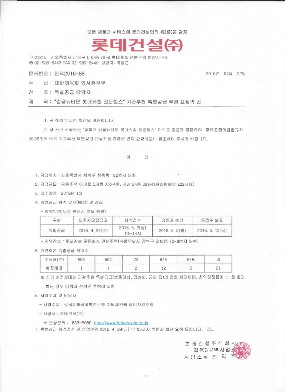 2. 위 호와 관련하여 롯데건설에서는 길음뉴타운 롯데캐슬 골든힐스 아파트 특별공급을 알려온 바,「주택공급에 관한규칙」 제35조에 의거 자격요건을 갖춘 대상자 중 희망자는 붙임자료를 참조하여 2016. 4. 27(수) 17:00까지 대한체육회 교육복지부로 제출하여 주시기 바랍니다.