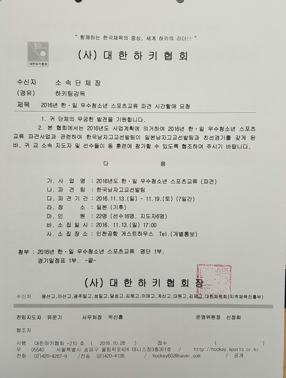 1. 사업명 : 2016년 한일우수청소년스포츠교류 파견