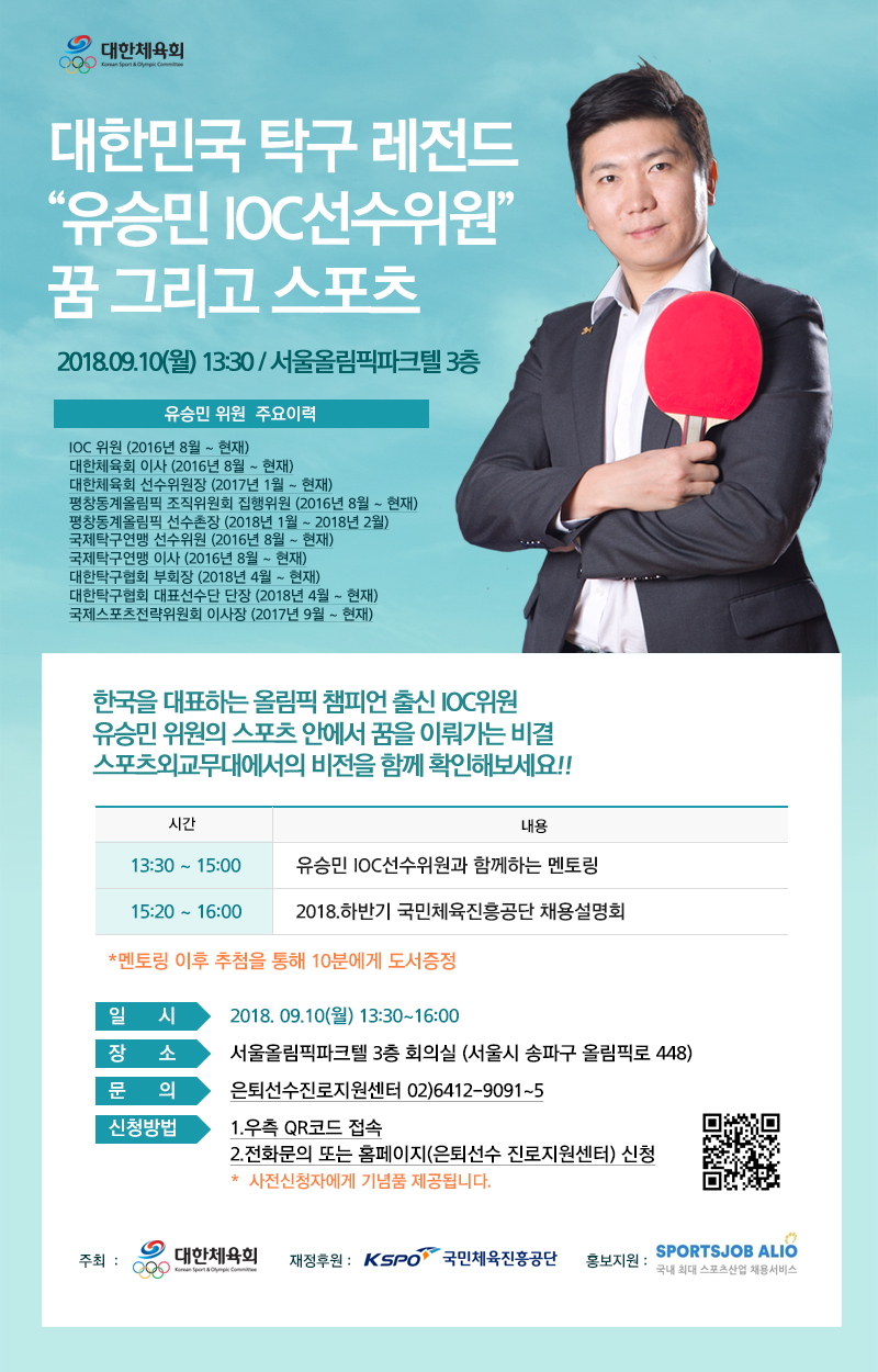 지금은 IOC 선수위원으로써 활동하고 있는 유승민 위원이 2018년 9월 10일(월) 특별한 시간을 마련합니다.