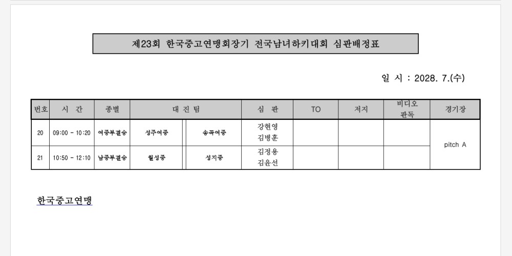 제23회 한국중고연맹회장기 전국하키대회 심판배정표(8.7.) 페이지 정보 작성자 하키협회 댓글 0건 조회 3,476회 작성일 24-08-01 본문 제23회 한국중고연맹회장기 전국하키대회 심판 배정표(8.7.) 목록 이전글 제35회 문화체육관광부장관기 전국중고하키대회 대회결과표 다음글 제38회 대통령기 전국하키대회 대표자회의 개최알림 이전글제35회 문화체육관광부장관기 전국중고하키대회 대회결과표 24.08.07 다음글제38회 대통령기 전국하키대회 대표자회의 개최알림 24.08.01