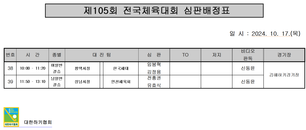 제105회 전국체육대회 심판배정표(10.17.) 수정사항 반영 페이지 정보 작성자 하키협회 댓글 0건 조회 2,860회 작성일 24-10-07 본문 제105회 전국체육대회 심판배정표(10.17.) 목록 이전글 제105회 전국체육대회 경기결과표 및 대회결과 다음글 제105회 전국체육대회 유니폼 배정표(10.17) 이전글제105회 전국체육대회 경기결과표 및 대회결과 24.10.08 다음글제105회 전국체육대회 유니폼 배정표(10.17) 24.10.06