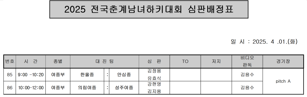 2025 전국춘계남녀하키대회 심판배정표(4.1.) 페이지 정보 작성자 하키협회 댓글 0건 조회 2,454회 작성일 25-03-19 본문 2025 전국춘계남녀하키대회 심판배정표(4.1.) 기피신청: 김용수 심판매니저 010-6394-1370 신청시간: 20:00-21:00 목록 이전글 2025 전국춘계남녀하키대회 경기결과표 다음글 2025 전국춘계남녀하키대회 심판브리핑 알림(3. 24.) 이전글2025 전국춘계남녀하키대회 경기결과표 25.03.20 다음글2025 전국춘계남녀하키대회 심판브리핑 알림(3. 24.) 25.03.17