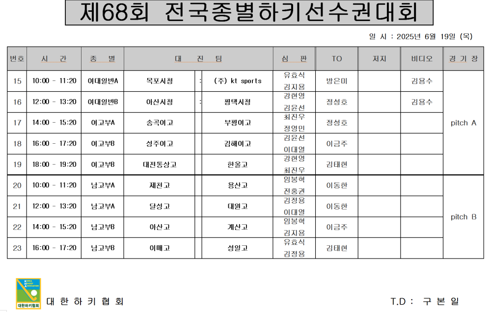 제68회 전국종별하키선수권대회 심판배정표(6.19.) 페이지 정보 작성자 하키협회 댓글 0건 조회 1,132회 작성일 25-06-18 본문 제68회 전국종별하키선수권대회 심판배정표(6.19.) 목록 이전글 제68회 전국종별하키선수권대회 심판배정표(6.20.) 다음글 제68회 전국종별하키선수권대회 심판배정표(6.18.) 이전글제68회 전국종별하키선수권대회 심판배정표(6.20.) 25.06.19 다음글제68회 전국종별하키선수권대회 심판배정표(6.18.) 25.06.17