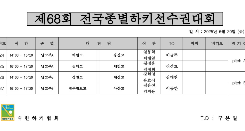 제68회 전국종별하키선수권대회 심판배정표(6.20.) 페이지 정보 작성자 하키협회 댓글 0건 조회 1,097회 작성일 25-06-19 본문 제68회 전국종별하키선수권대회 심판배정표(6.20.) 목록 이전글 제68회 전국종별하키선수권대회 심판배정표(6.21.) 다음글 제68회 전국종별하키선수권대회 심판배정표(6.19.) 이전글제68회 전국종별하키선수권대회 심판배정표(6.21.) 25.06.20 다음글제68회 전국종별하키선수권대회 심판배정표(6.19.) 25.06.18