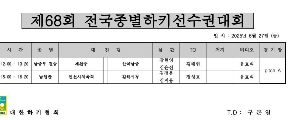 제68회 전국종별하키선수권대회 심판배정표(6.27.) 페이지 정보 작성자 하키협회 댓글 0건 조회 1,056회 작성일 25-06-26 본문 제68회 전국종별하키선수권대회 심판배정표(6.27.) 목록 이전글 제36회 문화체육관광부장관기 전국중고하키대회 개최 알림 다음글 2025 한국대학실업연맹 회장배 남여하키대회 경기일정표(수정) 이전글제36회 문화체육관광부장관기 전국중고하키대회 개최 알림 25.06.30 다음글2025 한국대학실업연맹 회장배 남여하키대회 경기일정표(수정) 25.06.26