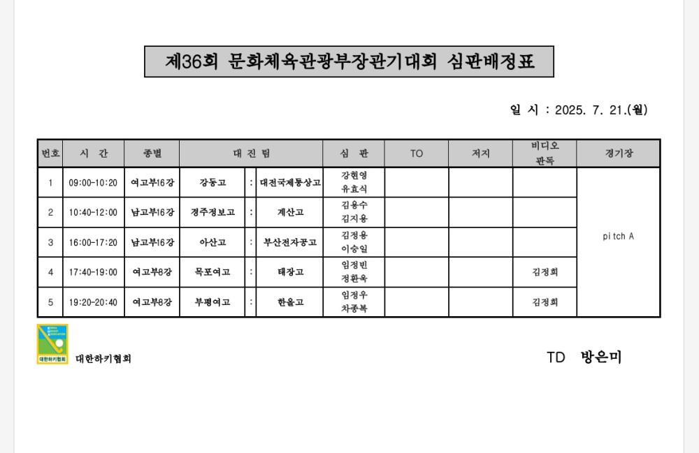 제36회 문화체육관광부장관기 전국중고하키대회 심판배정표(7.21.) 페이지 정보 작성자 하키협회 댓글 0건 조회 1,005회 작성일 25-07-20 본문 제36회 문화체육관광부장관기 전국중고하키대회 심판배정표(7.21.) 목록 이전글 제36회 문화체육관광부장관기 전국중고하키대회 경기결과표 다음글 제36회 문화체육관광부장관기 전국중고하키대회 이전글제36회 문화체육관광부장관기 전국중고하키대회 경기결과표 25.07.21 다음글제36회 문화체육관광부장관기 전국중고하키대회 25.07.20