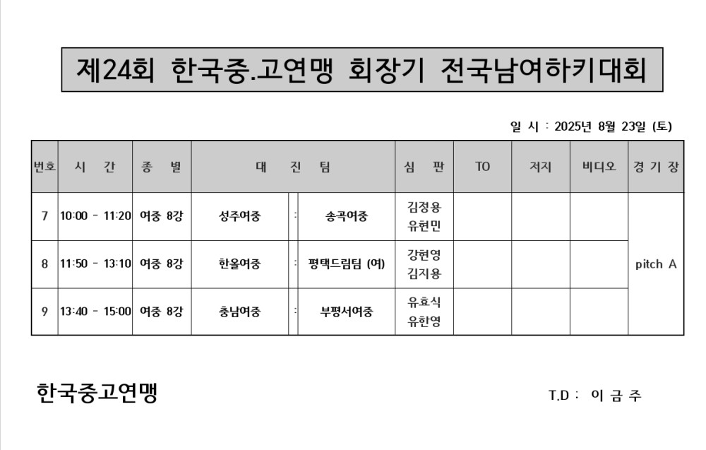 제24회 한국중∙고하키연맹 회장기 전국하키대회 심판배정표(8.23.) 페이지 정보 작성자 하키협회 댓글 0건 조회 973회 작성일 25-08-21 본문 제24회 한국중∙고하키연맹 회장기 전국하키대회 심판배정표(8.23.) 목록 이전글 2025 하키 U15 H1 디비전 리그 참가팀 현황 다음글 제25회 대한체육회장배 전국생활하키대회 대회 결과 이전글2025 하키 U15 H1 디비전 리그 참가팀 현황 25.08.22 다음글제25회 대한체육회장배 전국생활하키대회 대회 결과 25.08.19