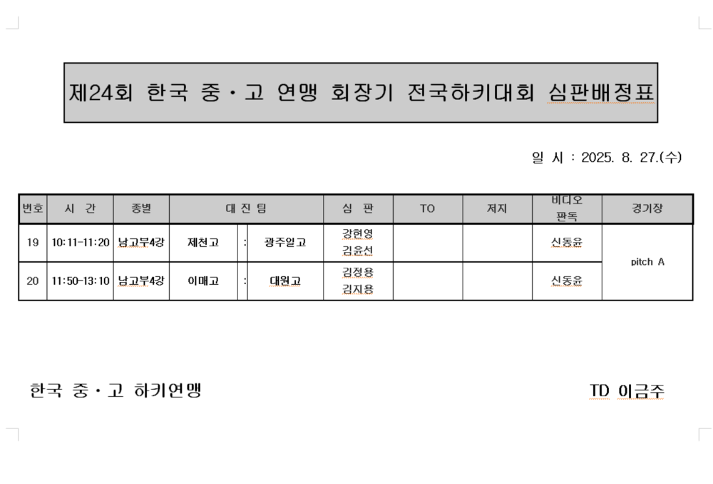 제24회 한국중∙고하키연맹 회장기 전국하키대회 심판배정표(8.27.) 페이지 정보 작성자 하키협회 댓글 0건 조회 748회 작성일 25-08-26 본문 제24회 한국중∙고하키연맹 회장기 전국하키대회 심판배정표(8.27.) 목록 이전글 2025 KHA 실내하키 U15 H1 디비전 리그 경기 일정표(추첨결과반영) 다음글 제24회 한국중∙고하키연맹 회장기 전국하키대회 심판배정표(8.26.) 이전글2025 KHA 실내하키 U15 H1 디비전 리그 경기 일정표(추첨결과반영) 25.08.27 다음글제24회 한국중∙고하키연맹 회장기 전국하키대회 심판배정표(8.26.) 25.08.23