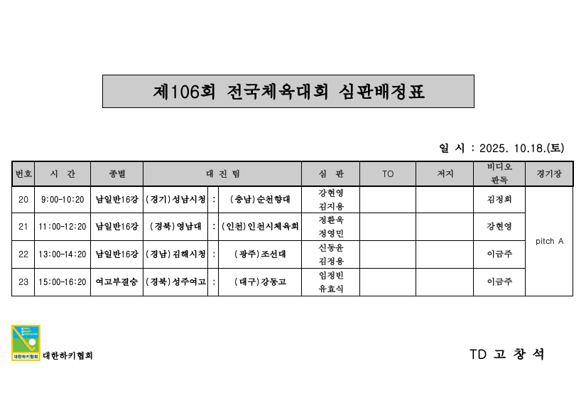 제106회 전국체육대회 심판배정표(10.18.) 페이지 정보 작성자 하키협회 댓글 0건 조회 670회 작성일 25-10-17 본문 제106회 전국체육대회 심판배정표(10.18.)경기로 인한 지연으로 10월 17일 22시까지 기피,제척사항을 받도록 하겠습니다. 목록 이전글 제106회 전국체육대회 심판배정표(10.19.) 다음글 제106회 전국체육대회 심판배정표(10.17.) 이전글제106회 전국체육대회 심판배정표(10.19.) 25.10.18 다음글제106회 전국체육대회 심판배정표(10.17.) 25.10.16