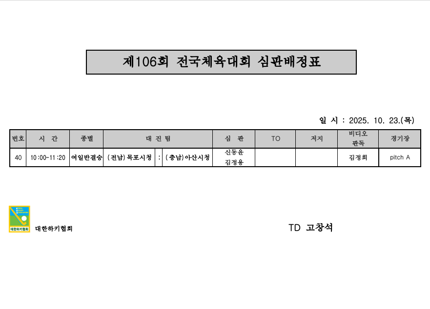 제106회 전국체육대회 심판배정표(10.23.) 페이지 정보 작성자 하키협회 댓글 0건 조회 612회 작성일 25-10-22 본문 제106회 전국체육대회 심판배정표(10.23.) 목록 이전글 제106회 전국체육대회 여자일반부 결승전 SOOP 라이브 중계 링크 다음글 2025 KHA 실내하키 U18 H1~H2 디비전 리그 개최 알림 이전글제106회 전국체육대회 여자일반부 결승전 SOOP 라이브 중계 링크 25.10.23 다음글2025 KHA 실내하키 U18 H1~H2 디비전 리그 개최 알림 25.10.22