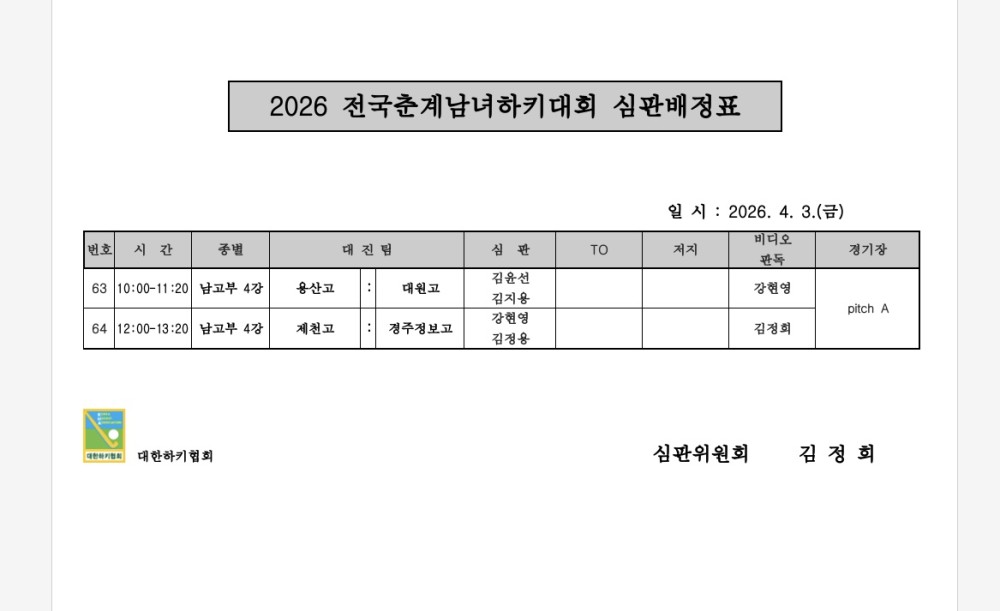 2026 전국춘계남녀하키대회 심판배정표 (04.03.) 페이지 정보 작성자 하키협회 댓글 0건 조회 151회 작성일 26-04-02 본문 2026 전국춘계남녀하키대회 심판배정표 (04.03.) 목록 이전글 제26회 협회장배 전국생활체육하키대회 경기일정표 다음글 2026 전국춘계남녀하키대회 유니폼 배정표 (4.4.) 이전글제26회 협회장배 전국생활체육하키대회 경기일정표 26.04.03 다음글2026 전국춘계남녀하키대회 유니폼 배정표 (4.4.) 26.04.02