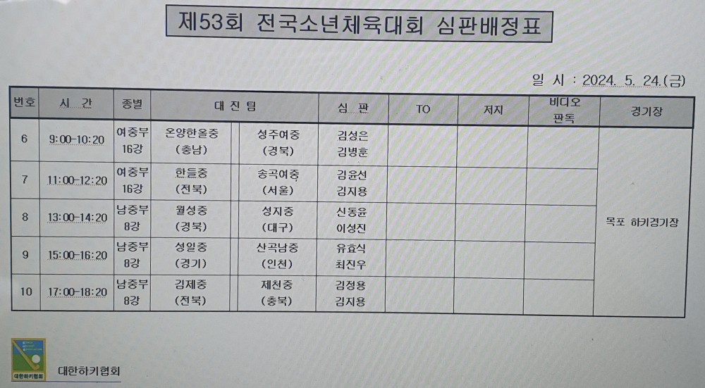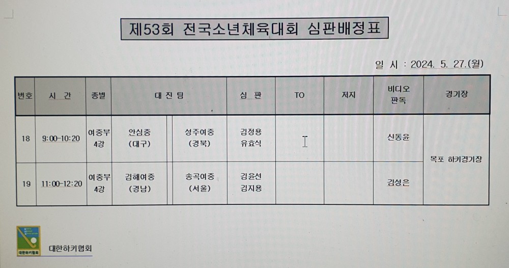 제53회 전국소년체육대회 심판배정표(5.28.) 페이지 정보 작성자 하키협회 댓글 0건 조회 4,029회 작성일 24-05-22 본문 제53회 전국소년체육대회 심판배정표(5.28.) 를 붙임과 같이 알려드립니다. 붙임: 심판배정표 1부. 끝. 첨부파일 심판배정표5월23일.hwp (56.5K) 목록 이전글 제53회 전국소년체육대회 경기결과 다음글 제53회 전국소년체육대회 유니폼 배정표 이전글제53회 전국소년체육대회 경기결과 24.05.23 다음글제53회 전국소년체육대회 유니폼 배정표 24.05.22